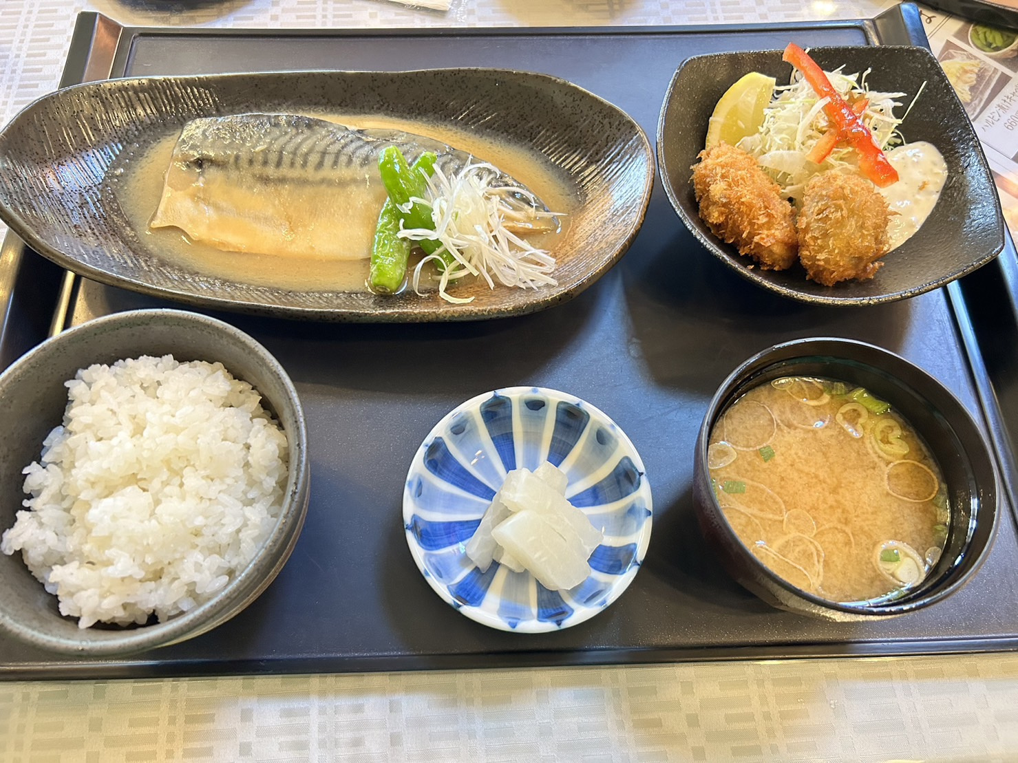 お昼には、サバの味噌煮、カキフライ定食を食べました。