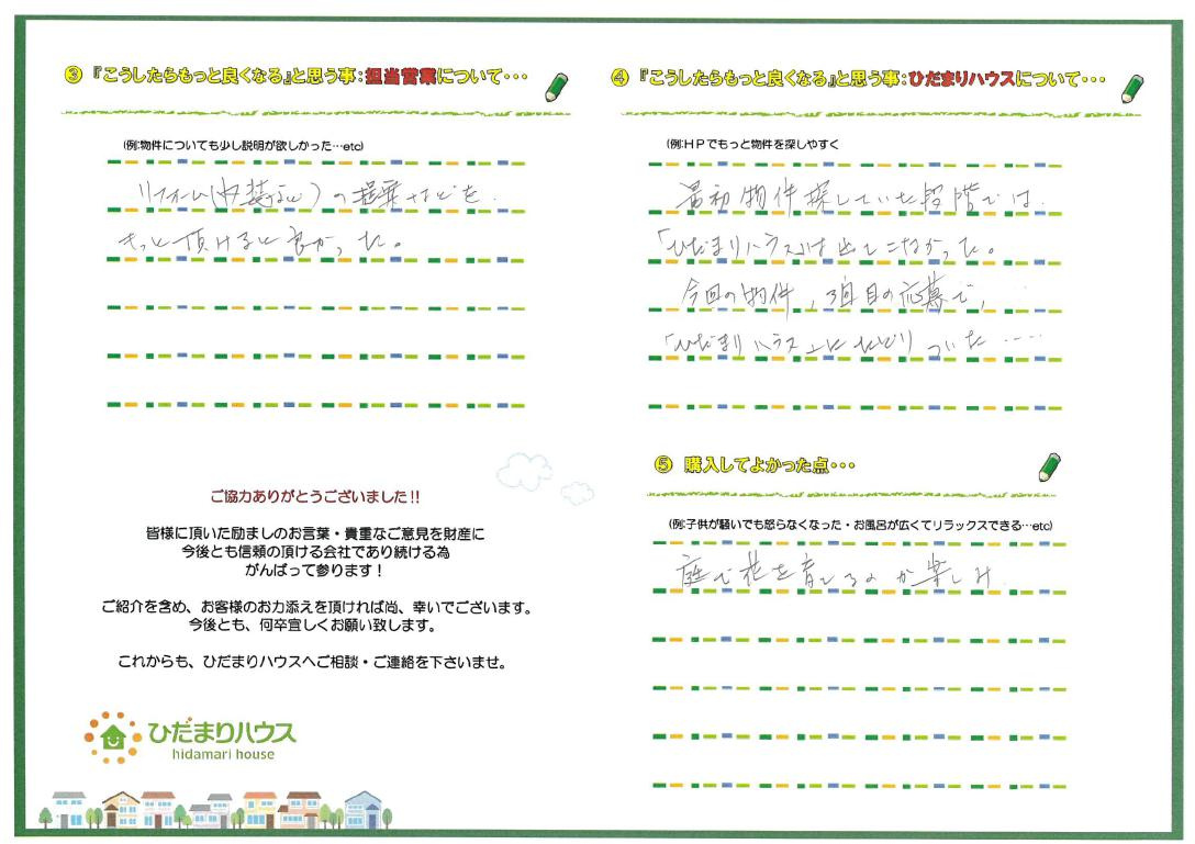 - リフォーム(内装など)の提案などをもっと頂けるとよかった