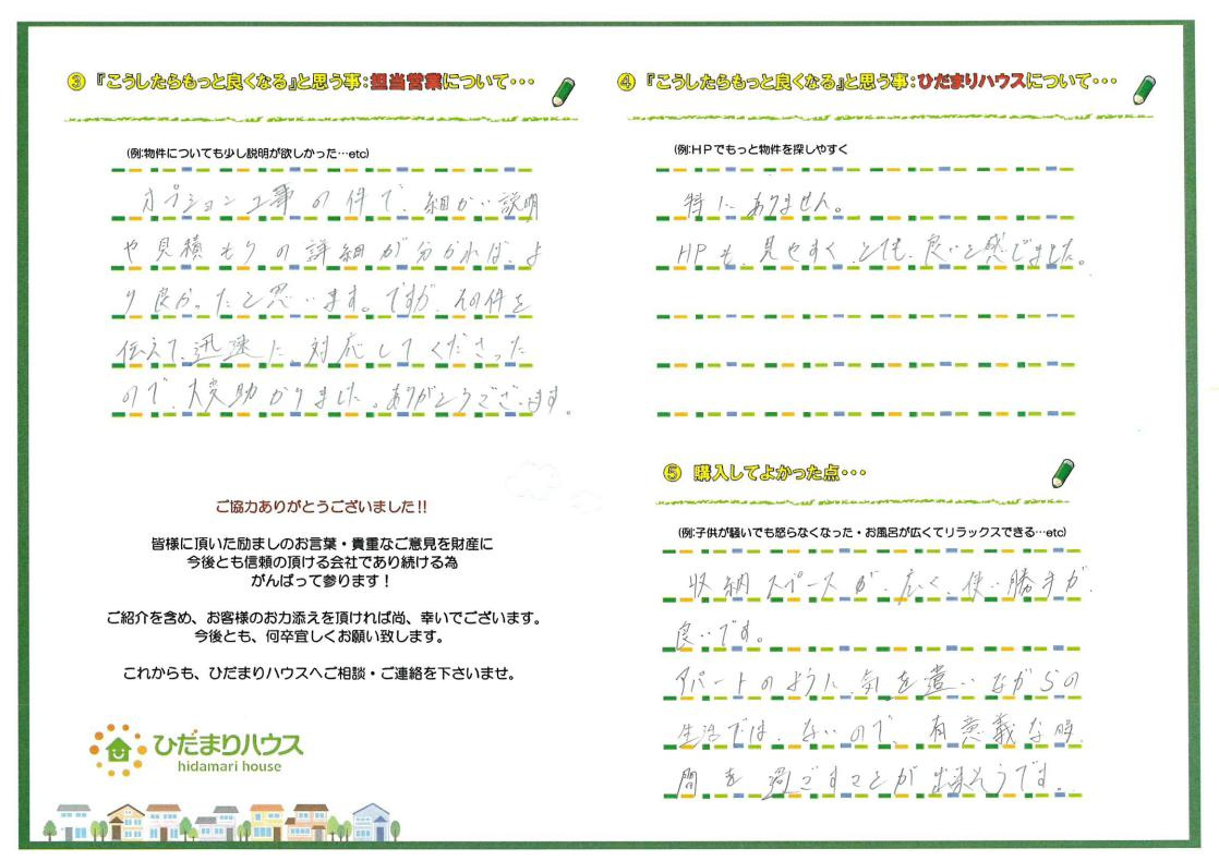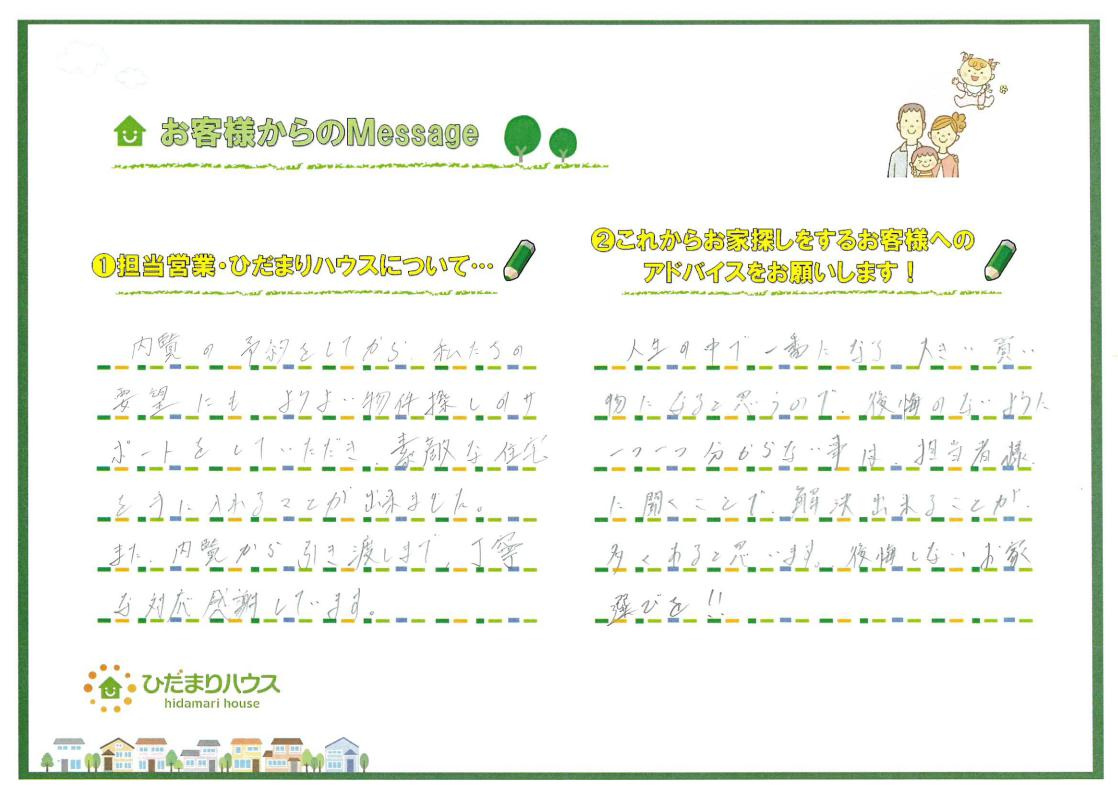 良い物件が見つかったこと、私にお引渡しまでお任せいただけたこと大変嬉しく思います。